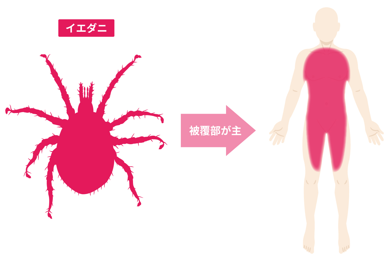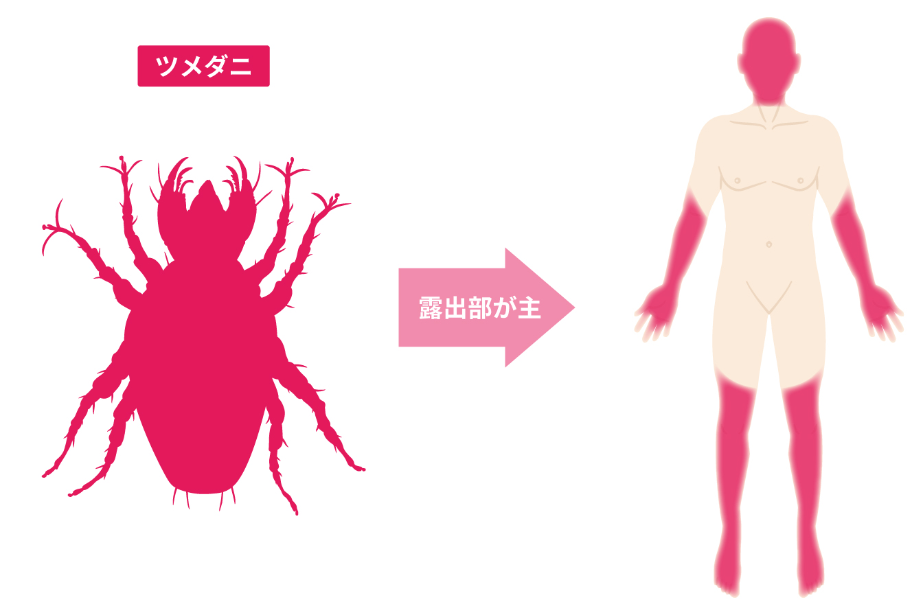ダニに刺されることで引き起こされるかゆみは、イエダニやツメダニによるものが代表的です。イエダニは衣類の内側、ツメダニなら肌の露出部に被害が見られます。その他、鳥に寄生するトリサシダニやスズメサシダニなどのダニや、ヒゼンダニの集団感染が話題になることもあり、ダニによって被害が起きやすい体の場所は異なります。