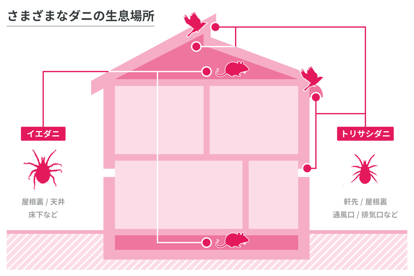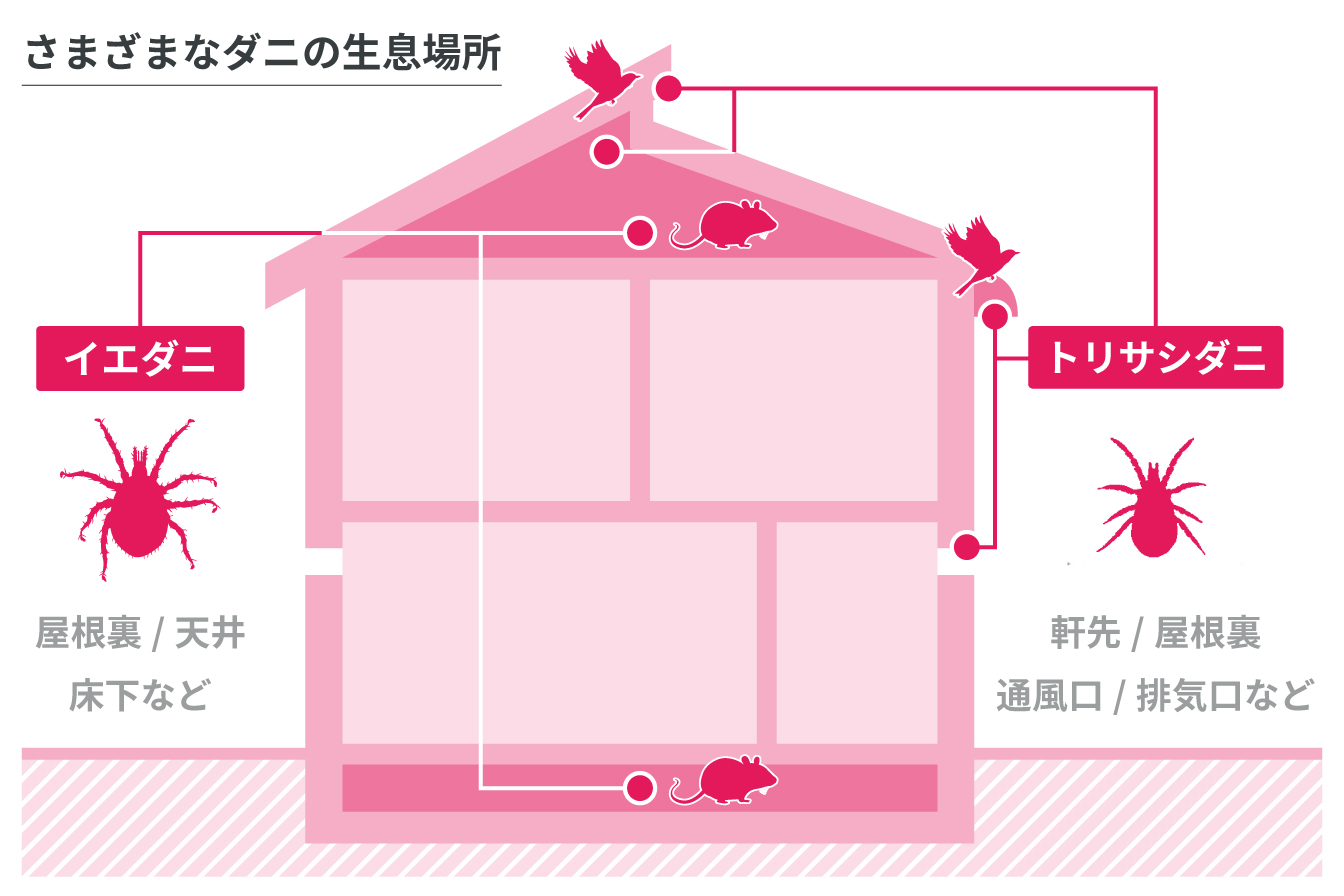 家の中でのダニによる被害でまず考えられるのは、イエダニです。イエダニはネズミなどに寄生し吸血するダニ。イエダニという名前から、家(居室内)のホコリから多く見つかるダニアレルギーの原因となるダニと誤解されることがありますが、イエダニは気管支喘息やアレルギー性鼻炎などのアレルギー疾患の原因となるチリダニ(ヒョウヒダニ)とは別の種類です。イエダニに刺されると、痒みを伴う赤いブツブツ(紅斑や紅色丘疹)が現れます。屋根裏、天井、床下などのネズミの巣から人のいる空間に侵入し、人からも吸血します。特に寄主であるネズミが移動あるいは死亡していなくなると、イエダニは室内に移動して、代わりに人から吸血するようになります。人の被害が多く起こるのは6月〜9月です。イエダニは、夜間に室内に侵入し、寝具の中に潜り込み、衣服に被われた皮膚の軟らかい部位を好んで刺します。そのため、顔面や手などの露出している箇所を刺すことはほとんどなく、下腹部や腋の下、腰部やふとももの内側などがよく刺されます。その他、軒先や屋根裏、通風口、排気口などに鳥の巣がある場合は、トリサシダニ、スズメサシダニなど鳥に寄生するダニが室内に侵入して人からも吸血することがあります。また鶏舎が近隣にある場合は、ニワトリに寄生するワクモによる吸血被害が生じることもあります。