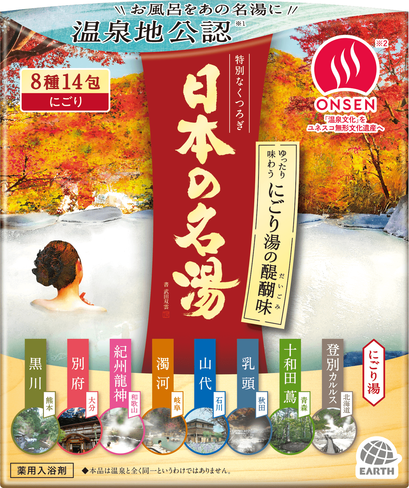 販売名:蝦夷の湯 登別カルルスD-a、田沢の湯 乳頭A-a、加賀の湯 山代D-b、肥後の国の湯 黒川A-a、陸奥の湯 鳴子A-a、下野の湯 那須塩原A-a、信州の湯 野沢A-a、奥飛騨の湯 新穂高C-a、美作の国の湯 湯原A-a、伊予の湯 道後B-a