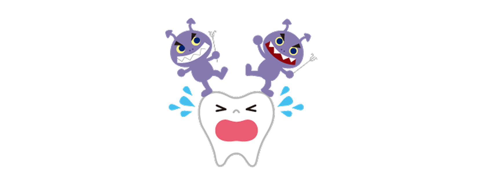 むし歯ができる口の中にはたくさんの菌が住んでいます。むし歯菌の代表的なものは「ミュータンス菌」と呼ばれる菌です。むし歯や歯周病の原因であるプラーク(歯垢)は、歯の表面に付着した菌の固まりです。食事の後、歯の表面に汚れが付着すると、むし歯菌たちがそこから栄養を吸収し、酸を出します。この酸によって、歯のエナメル質が溶けてしまう「脱灰(だっかい)」が起きます。