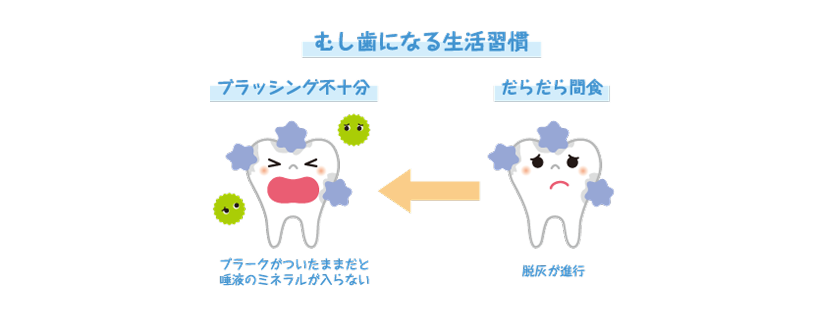 せっかく再石灰化という修復能力があるにもかかわらず、間食したり、プラークが残っていると、歯の再石灰化が追いつかずにむし歯になってしまいます。生活習慣にメリハリをつけ、歯磨きできちんとプラークを除去し、お口の中の働きを健全に保ってあげましょう。