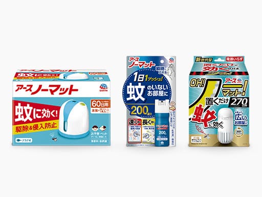 「蚊とり」は虫ケア用品(家庭用殺虫剤)のうち、蚊成虫の駆除を目的とした製品です。虫ケア用品のうち、蚊やハエ、ゴキブリなどの「衛生害虫*」の駆除を目的とした製品は、薬機法に基づき医薬品や防除用医薬部外品の承認を受けなければ製造販売できません。承認を受ける際には安全性に関しても急性毒性、亜急性毒性、遺伝毒性、刺激性、感作性(アレルギー性)などの数多くの安全性試験結果を元に厚生労働省が厳しく審査を行い、一般の人が使用しても安全であることが確認されたうえで、製品を製造・販売できるようになります。よって、アース製薬の「蚊とり」も安全性が認められた製品を製造・販売しています。