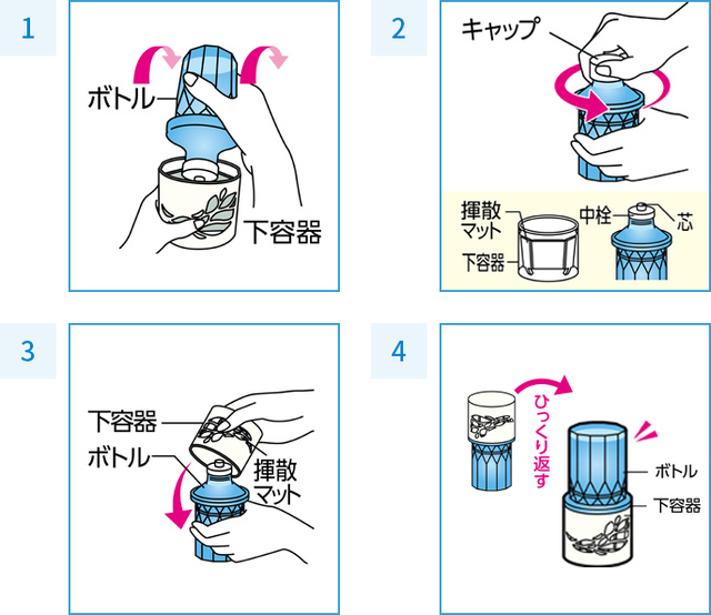下容器の揮散マット、ボトルについている中栓と芯は取りはずさない。